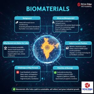 - India’s biomaterials sector includes bioplastics, biopolymers, and bio-derived materials.