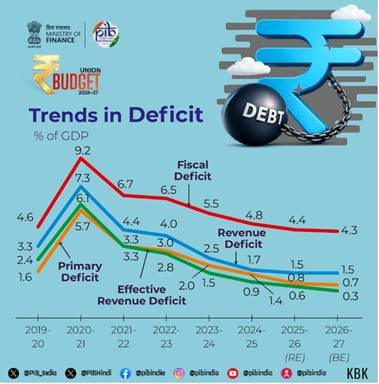 - Fiscal deficit lowered from 4.4% to 4.3% of GDP in FY27.