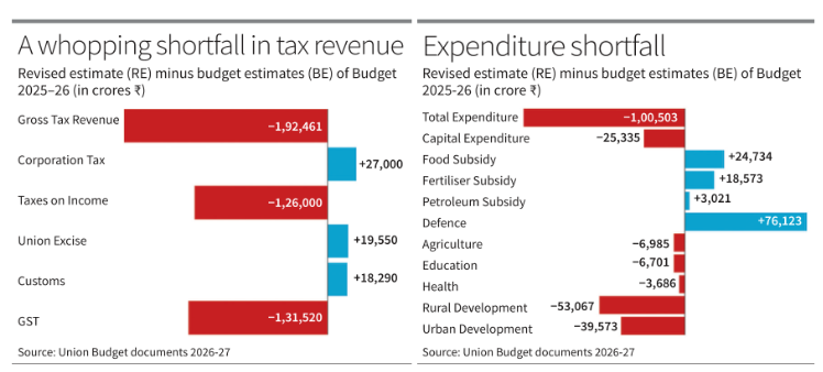 - Income tax collections fell short of estimates by ₹1.26 lakh crore in Revised Estimates.