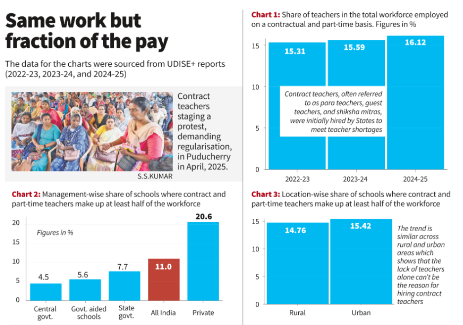 - UDISE+ data shows contract teachers form about 16% workforce.