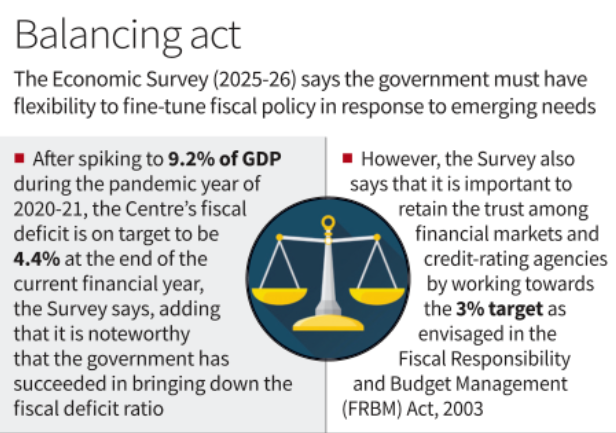 • The Economic Survey 2025–26 supports delaying strict FRBM fiscal targets for the Centre.
