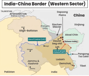 - Western Sector (Ladakh):Dispute over Johnson Line (British/Indian claim) vs McDonald Line (Chinese claim). Main conflict area: Aksai Chin.