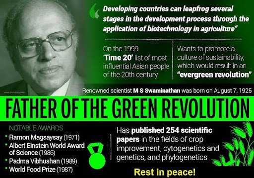 - Swaminathan later stressed the need for an “Evergreen Revolution” focused on sustainability.