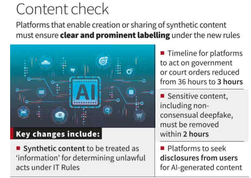 - Union government amended Information Technology Rules, 2026 to regulate AI-generated content.