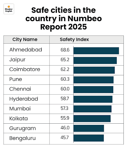 Why in News: India’s ranking and city-wise safety scores have been highlighted in the 2025 Numbeo Safety Index report, sparking discussions on urban safety challenges and the need for improved law enforcement and civic infrastructure, especially in cities.