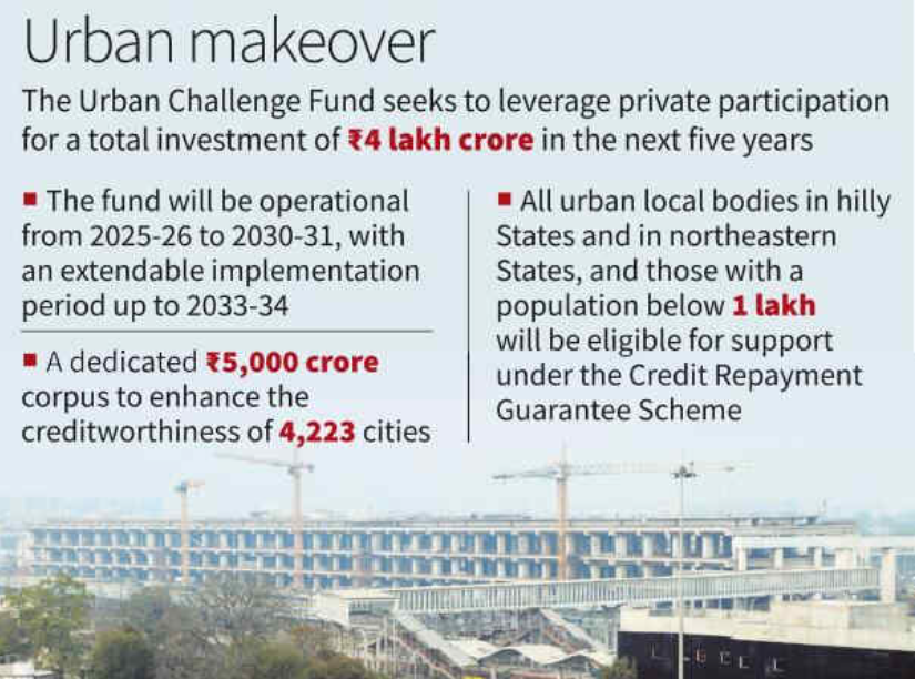 Context: The Union Cabinet approved the launch of the Urban Challenge Fund (UCF) under the Ministry of Housing and Urban Affairs. The fund will support high-impact urban infrastructure projects with Central assistance of ₹1 lakh crore, aiming to catalyse nearly ₹4 lakh crore investment over five years.