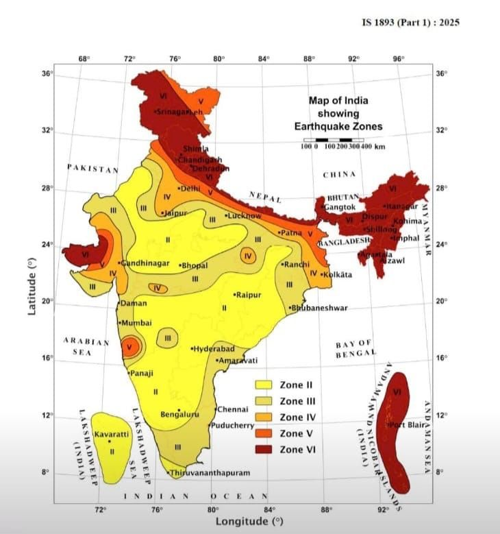 - Updated map is issued by Bureau of Indian Standards (BIS) under revised Earthquake Design Code, 2025.