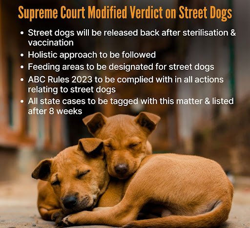 • Contradiction with prior SC judgment (2024): The earlier Bench upheld Animal Birth Control (ABC) Rules, 2023, rooted in humane and scientific methods.