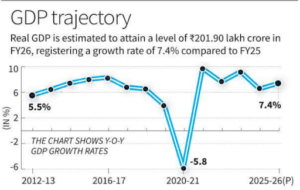 Context: The Union government estimated real GDP growth at 7.4% for FY 2025-26, up from 6.5% recorded the previous year.